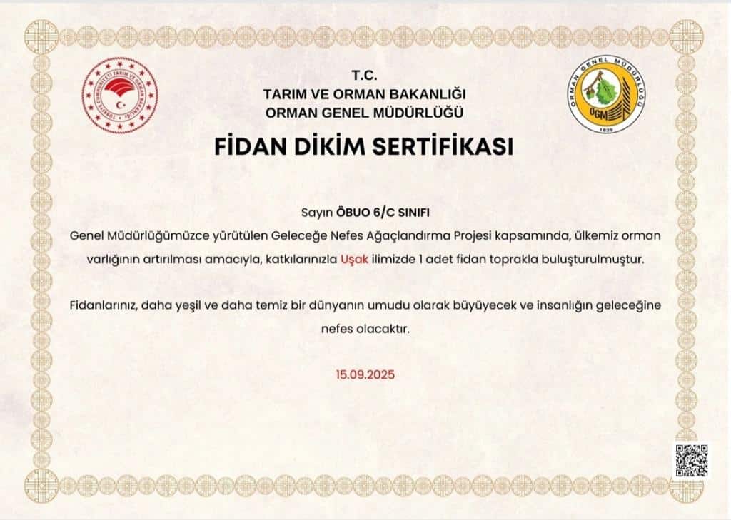 BENİM OKULUM GELECEĞE ÇAĞRI YEŞİL VATAN ETKİNLİKLERİ KAPSAMINDA www.gelecegenefes.gov.tr ADRESİ ÜZRİNDEN 6/C SINIFI OLARAK İLİMİZ UŞAK İÇİN FİDAN BAĞIŞINDA BULUNDUK. SEN DE GELECEĞE NEFES OL YEŞİL VATANI KORU